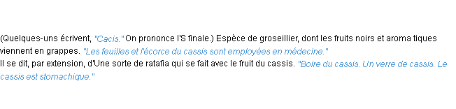 Définition développée dans dictionnaire d’Emile Littré (ancienne édition de 1876).Merci à Danièle et Seraphine pour la numérisation du mot cassis.