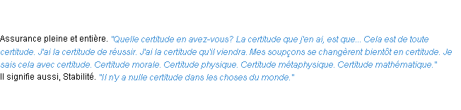 Ancienne signification éditée par l’Académie Française, année 1798.Merci à Michèle et Gaspard pour la numérisation du mot certitude.