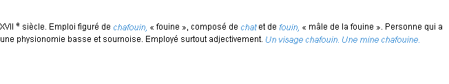 Ancienne signification développée en 1798 par l’académie Française (ACAD - 1798).Merci à Perrine et Inès pour la numérisation du mot chafouin.