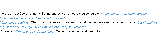 Ancienne signification éditée en 1798 pour le terme « chanoine » par l’Académie Française.Merci à Cerise et Gwenaelle pour la numérisation du mot chanoine.