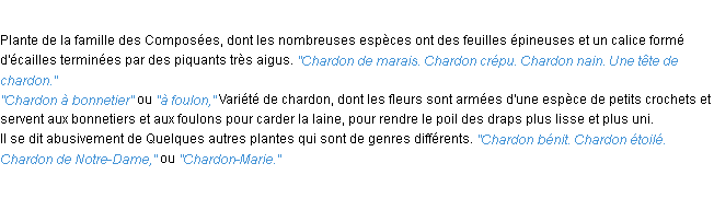 Ancienne signification développée en 1798 par l’académie Française (ACAD - 1798).Merci à Paulette et Germain pour la numérisation du mot chardon.