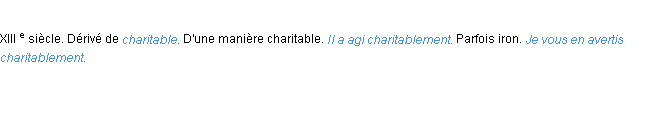 Signification du terme « charitablement », parution de 1986, dictionnaire académique Français.