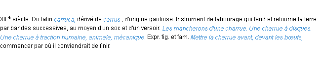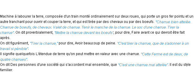 Ancienne signification du terme « charrue », parution de 1798, dictionnaire académique Français.Merci à Mariette et Matthieu pour la numérisation du mot charrue.