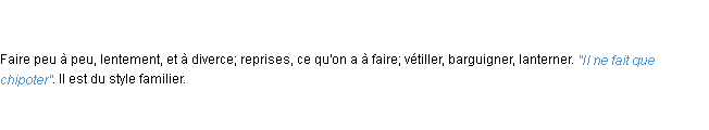 Ancienne signification parue en 1798 dans dictionnaire de l’Académie Française.Merci à Hercule et Lazare pour la numérisation du mot chipoter.