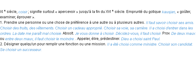Ancienne signification éditée en 1798 pour le terme « choisir » par l’Académie Française.Merci à Marise et Blaise pour la numérisation du mot choisir.