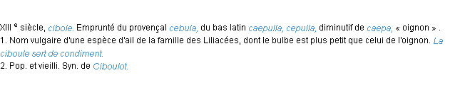 Ancienne signification développée en 1798 par l’académie Française (ACAD - 1798).Merci à éliane et Romain pour la numérisation du mot ciboule.