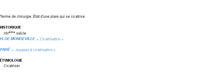 Définition développée dans dictionnaire d’Emile Littré (ancienne édition de 1876).Merci à Barnabé et Christophe pour la numérisation du mot cicatrisation.
