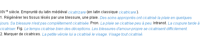 Ancienne définition « cicatriser » du dictionnaire académique Français, parution de l’année 1798.Merci à Félix et Jolie pour la numérisation du mot cicatriser.