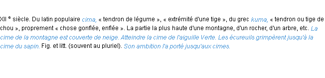 Ancienne signification développée en 1798 par l’académie Française (ACAD - 1798).Merci à Barnabé et élodie pour la numérisation du mot cime.