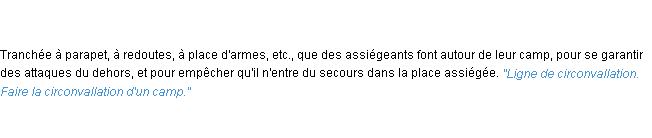 Ancienne signification parue en 1798 dans dictionnaire de l’Académie Française.Merci à Jean-baptiste et Sévérine pour la numérisation du mot circonvallation.