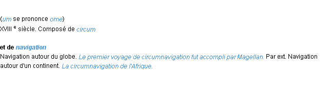 Signification parue en 2009 (source la-definition.fr).Merci à Marc et Nadine pour la numérisation du mot circumnavigation.