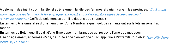 Ancienne signification développée en 1798 par l’académie Française (ACAD - 1798).Merci à Martine et Gérard pour la numérisation du mot coiffe.