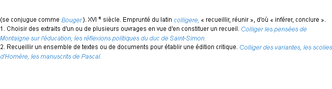 Ancienne signification développée en 1798 par l’académie Française (ACAD - 1798).Merci à Juliette et Laurent pour la numérisation du mot colliger.