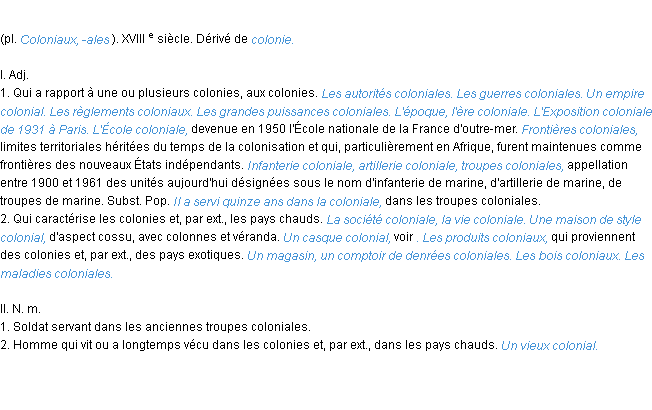 Signification éditée en 2010 par l’équipe de la-definition.fr.Merci à Madeline et Lazare pour la numérisation du mot colonial.
