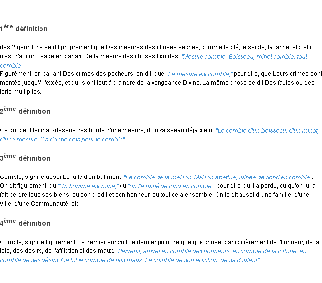 Ancienne signification éditée par l’Académie Française, année 1798.Merci à Lionel et Nicolas pour la numérisation du mot comble.