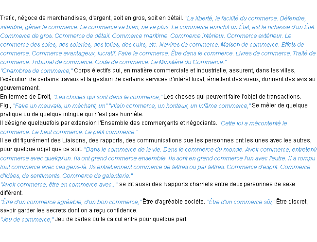 Ancienne définition académique pour le terme « commerce » (parue en 1798).Merci à Angelique et Rémi pour la numérisation du mot commerce.