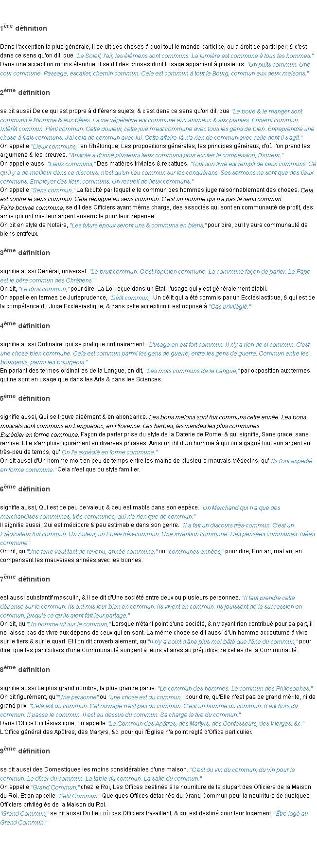 Ancienne définition du mot « commun » par l’Académie Française (édition de 17962).Merci à Baptiste et Paschal pour la numérisation du mot commun.