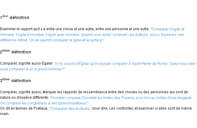 Ancienne définition de « comparer » de source académique (Académie Française, parution de 1798).Merci à Hélène et Aimée pour la numérisation du mot comparer.