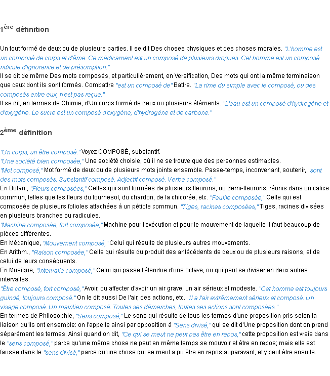 Ancienne signification éditée en 1798 pour le terme « composé » par l’Académie Française.Merci à Jeannot et Nicolas pour la numérisation du mot composé.