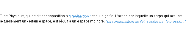 Signification éditée en 1876 pour le terme « condensation » par Emile Littré.Merci à Edwige et Ghislain pour la numérisation du mot condensation.