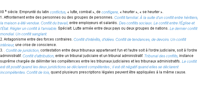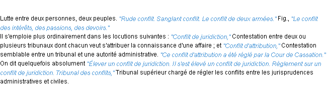 Ancienne signification du terme « conflit », parution de 1798, dictionnaire académique Français.Merci à Manon et Baudouin pour la numérisation du mot conflit.