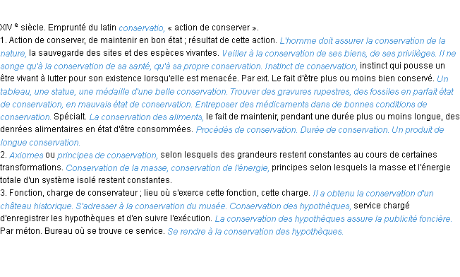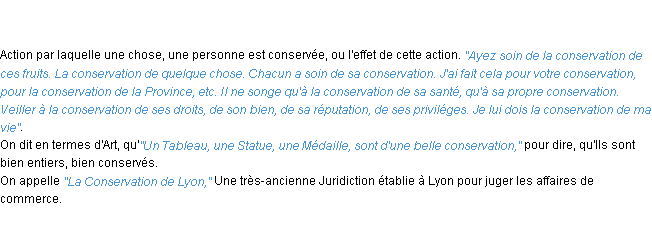 Ancienne signification éditée par l’Académie Française, année 1798.Merci à Léonard et Claudine pour la numérisation du mot conservation.