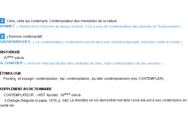 Définition d’Emile Littré (édition de 1876) pour le mot « contemplateur ».Merci à Olivier et Aurélie pour la numérisation du mot contemplateur.