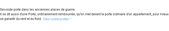 Signification développée en 1876 par Mr Littré (dictionnaire dit d’Emile Littré).Merci à Geneviève et Marie pour la numérisation du mot contre-porte.