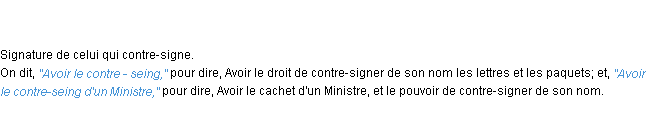 Signification développée en 1788 par Mr Féraud (dictionnaire dit « le Féraud »).Merci à Josiane et Doriane pour la numérisation du mot contre-seing.
