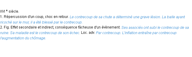 Signification éditée en 2008 pour le terme « contrecoup » par l’équipe de wiktionary France.Merci à Sidonie et Aurore pour la numérisation du mot contrecoup.
