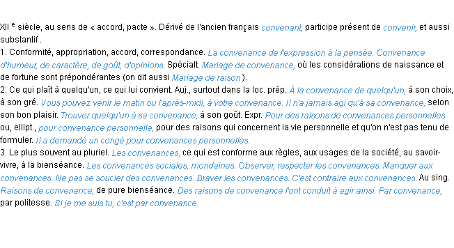 Ancienne signification développée en 1798 par l’académie Française (ACAD - 1798).Merci à Antoine et Jean-marie pour la numérisation du mot convenance.