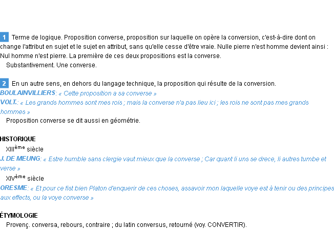 Signification développée en 1876 par Mr Littré (dictionnaire dit d’Emile Littré).Merci à Placide et Hervé pour la numérisation du mot converse.