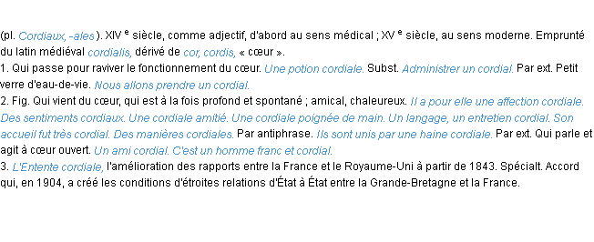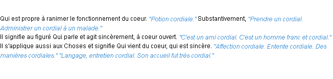 Ancienne signification éditée par l’Académie Française, année 1798.Merci à Joelle et Odile pour la numérisation du mot cordial.
