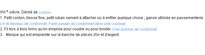 Ancienne signification développée en 1798 par l’académie Française (ACAD - 1798).Merci à Béatrice et Christelle pour la numérisation du mot cordonnet.