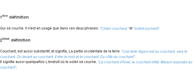 Ancienne signification éditée par l’Académie Française, année 1798.Merci à Josèphe et Julien pour la numérisation du mot couchant.