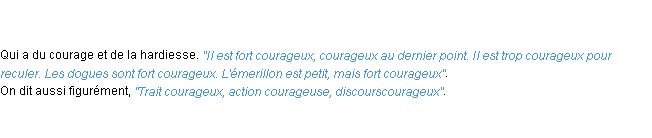 Ancienne définition de l’Académie Française (édition de 1798) pour le mot « courageux ».Merci à Gaétan et émile pour la numérisation du mot courageux.