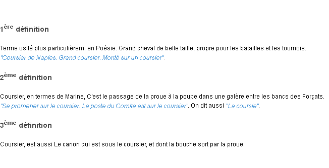 Ancienne signification éditée par l’Académie Française, année 1798.Merci à Aurélie et Marise pour la numérisation du mot coursier.