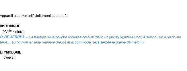 Signification développée en 1876 par Mr Littré (dictionnaire dit d’Emile Littré).Merci à Axelle et Fiacre pour la numérisation du mot couvoir.