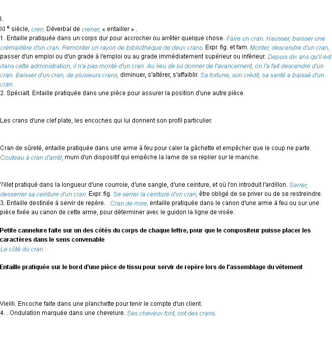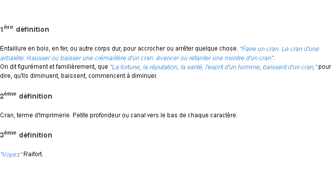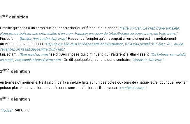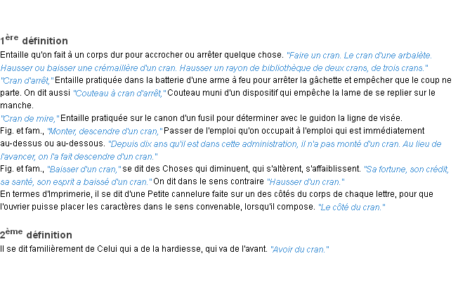 Définition académique pour le terme « cran » (parue en 1986).