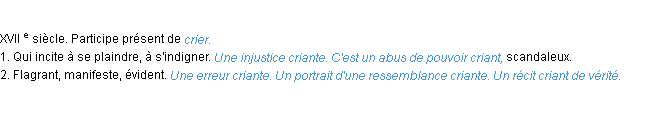 Ancienne définition développée dans dictionnaire académique, 1798.Merci à Marie et Jeannette pour la numérisation du mot criant.
