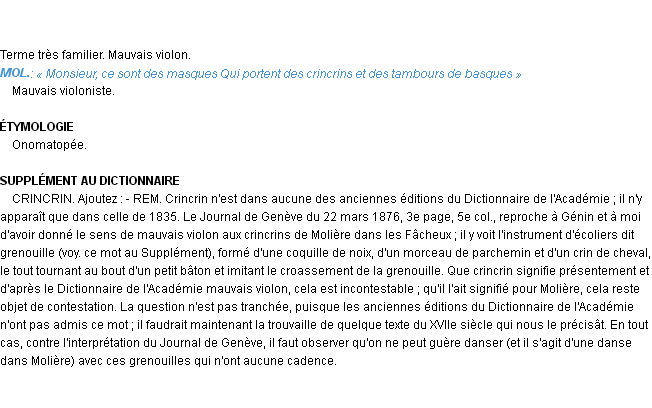 Définition du mot « crincrin » par Emile Littré (édition de 1876).Merci à Germaine et Florianne pour la numérisation du mot crincrin.