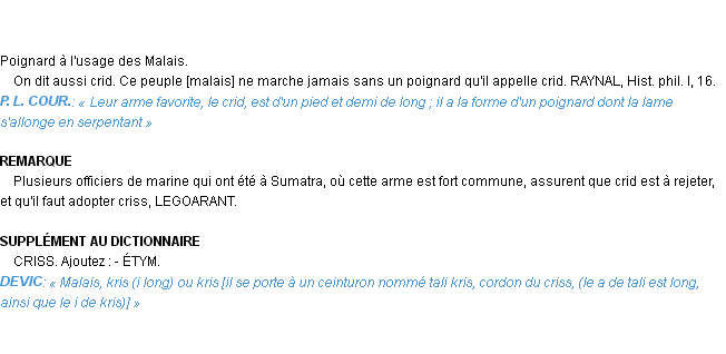 Signification éditée en 1876 pour le terme « criss » par Emile Littré.Merci à Yves et Manon pour la numérisation du mot criss.