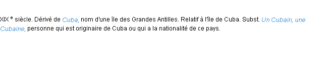 Définition issue du dictionnaire wiktionary pour le mot « cubain ».Merci à Barnabé et Célestine pour la numérisation du mot cubain.