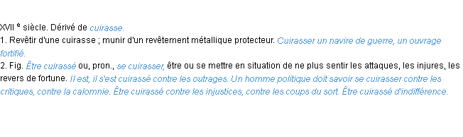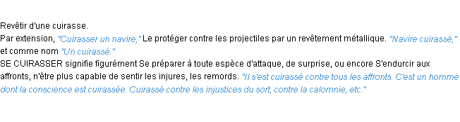 Ancienne signification éditée en 1798 pour le terme « cuirasser » par l’Académie Française.Merci à Célestine et Apolline pour la numérisation du mot cuirasser.