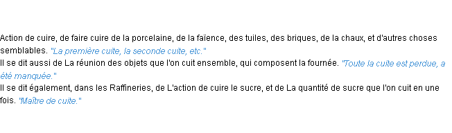 Ancienne définition de l’Académie Française (édition de 1835) pour le mot « cuite ».