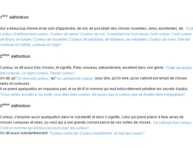Ancienne définition « curieux » du dictionnaire académique Français, parution de l’année 1798.Merci à Frédéric et Noel pour la numérisation du mot curieux.