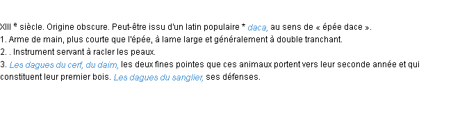 Ancienne signification issue du dico de l’Académie Française, parue en 1798.Merci à Jeannot et Sidonie pour la numérisation du mot dague.