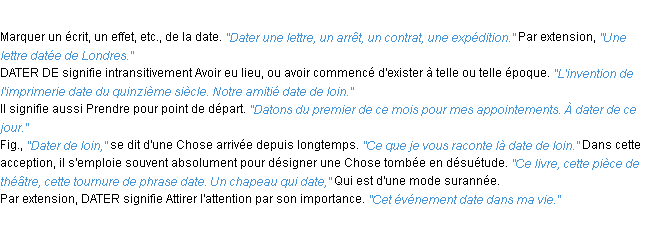 Ancienne définition académique pour le terme « dater » (parue en 1798).Merci à Fabrice et Gilberte pour la numérisation du mot dater.