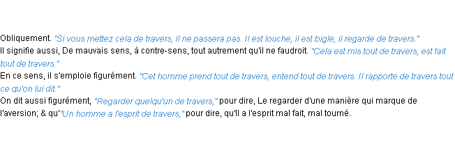Ancienne définition académique pour le terme « de travers » (parue en 17962).