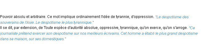 Ancienne signification développée en 1798 par l’académie Française (ACAD - 1798).Merci à Fernande et Angèle pour la numérisation du mot despotisme.